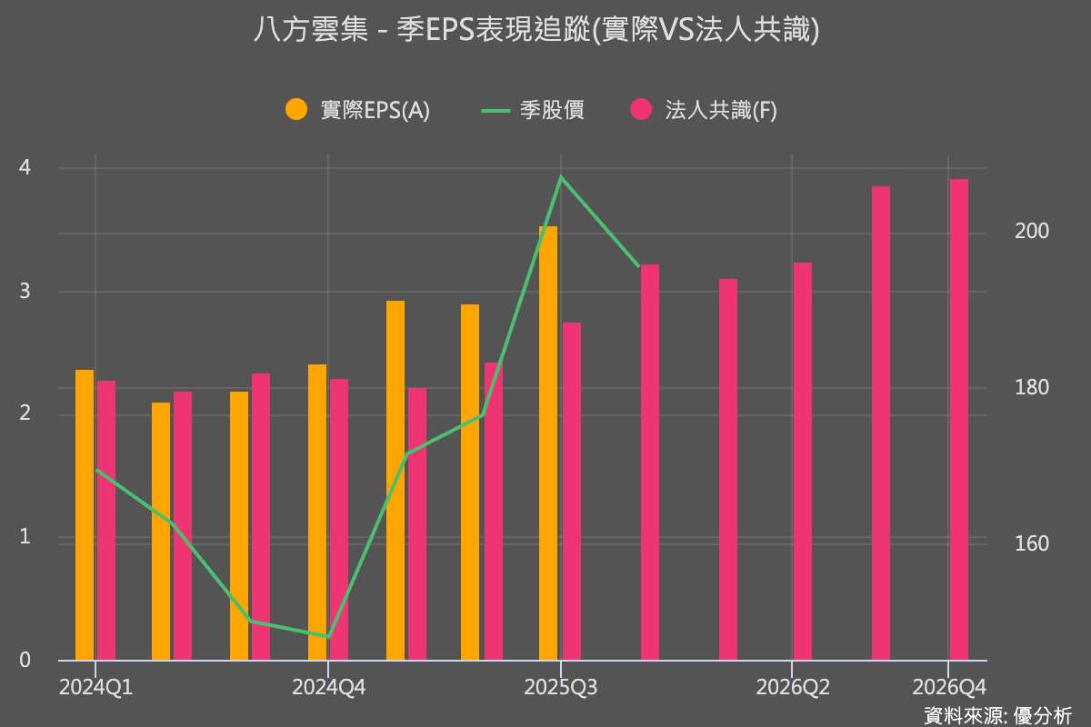 從營運結構來看,八方雲集今年在台灣市場走完三年「汰弱留強」後,門店數重新回到成長軌道,成為支撐營收斜率的底盤。截至11月底,台灣八方雲集共1,038家,今年新開44家、關18家,淨增26家;梁社漢排骨今年淨增18家。公司並規劃明年台灣八方雲集與梁社漢合計新增30家店,展店動能轉正,有助強化2026年的營收能見度。