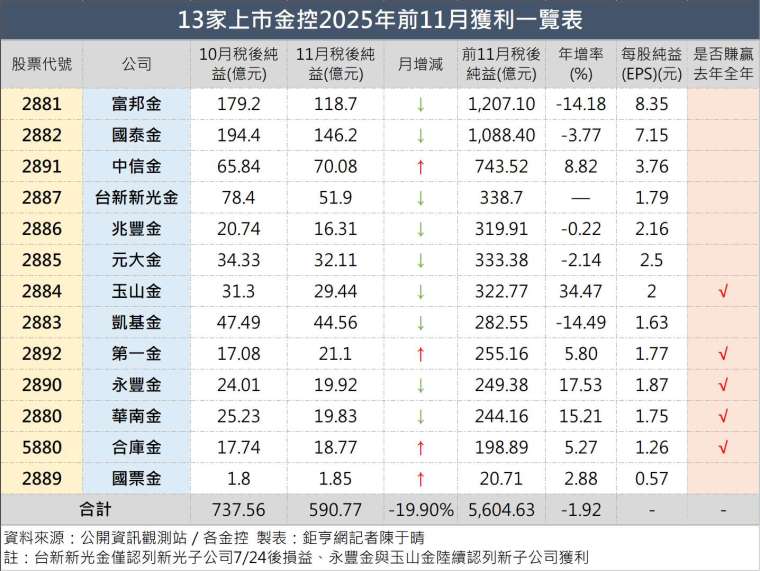 13 家上市金控 2025 年 11 月自結獲利全數出爐!儘管台股面臨震盪回檔壓力,但台幣相對走貶有利壽險業表現,銀行業放款、淨利息收入及財管業務也持續成長。根據各公司公告,13 家金控 11 月稅後純益合計為 590.87 億元,月減 19.9%,前 11 月累計稅後純益達 5604.93 億元 (不含原新光金今年截至 7/24 前的損益),年減 1.92%。值得注意的是,國泰金連二月奪下單月獲利王,累計獲利與每股獲利王仍是富邦金,共有 5 家金控前 11 月已經賺贏去年全年,分別為玉山金、永豐金、第一金、華南金及合庫金。