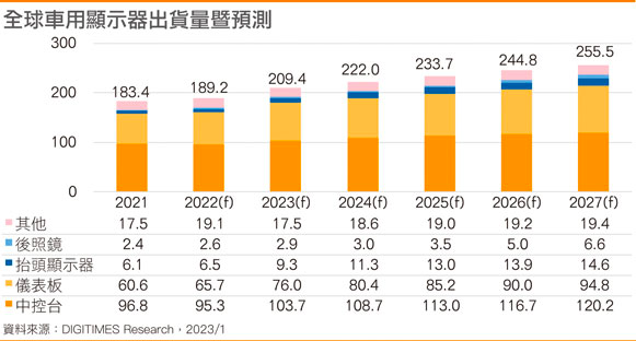 再根據台灣更專業的研究機構Digitimes統計預估,車用面板出貨量將從2022年的189億片,提高到2027年的255.5億片,總共會增加60億片,年複合成長率6.19%。