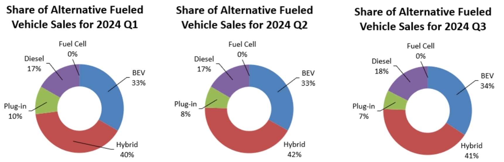 BEV 的市場占比穩定維持在33%至34%,表明其在美國替代能源車市場中有穩定的需求,但未見顯著增長。