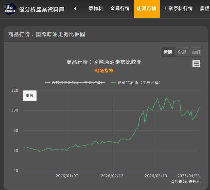 布蘭特原油價格目前逼近 100 美元大關,相較過去三年的均價 60-70 美元,漲幅高達 50%。高油價代表通膨難降,聯準會降息的期待恐將落空。高利率與高能源成本將直接衝擊企業的毛利空間。