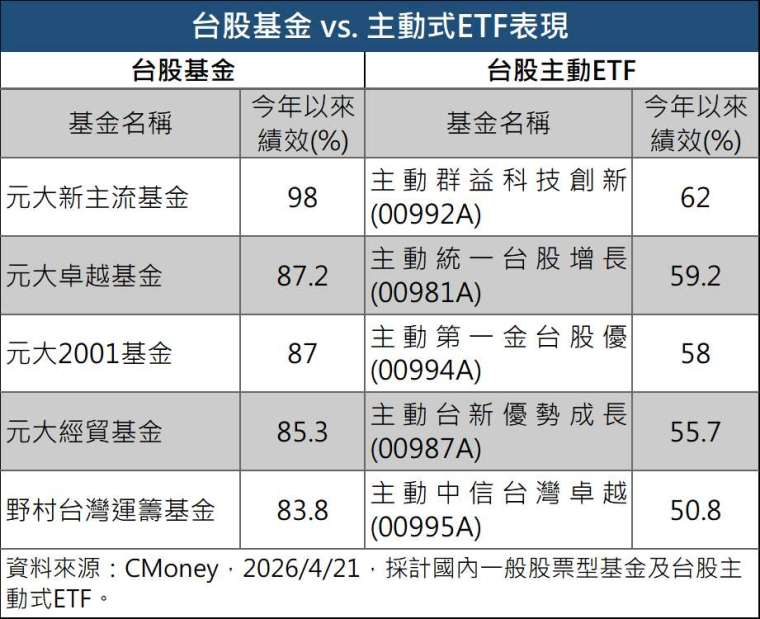 相較近期熱度極高的台股主動式 ETF,同期間平均績效 41.4% 外,績效最強的主動群益科技創新 (00992A-TW) 僅 62%,而近期成交量大、熱度極高的 00981A 59.2% 次之。