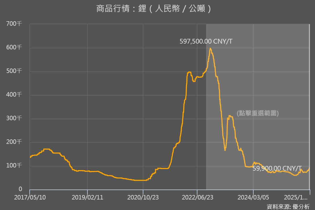 2025年11月25日(優分析/產業數據中心報導)⸺ 受益於市場對非中國製鋰礦的偏好升溫,加上能源儲能市場因AI發展而快速擴張,鋰價近期展現強勁反彈力道,觸及每公斤 90 人民幣的高點。