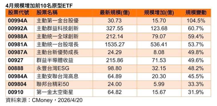 受到中東局勢和談曙光牽動,4 月全球金融市場強勢反彈,在投資人樂觀氣氛帶動下,台灣整體 ETF 規模加速飆增逾 7000 億元,最新規模達新台幣 8.9 兆元。市場人氣最熱的主動式 ETF 成為 4 月成長主力,根據 CMoney 資料統計,成長率第一名為主動第一金台股優 (00994A-TW),4 月規模翻倍,成長率達 104.5%;增加金額第一名為主動統一台股增長 (00981A-TW),4 月規模激增 536.41 億元,成長率達 53.7%。