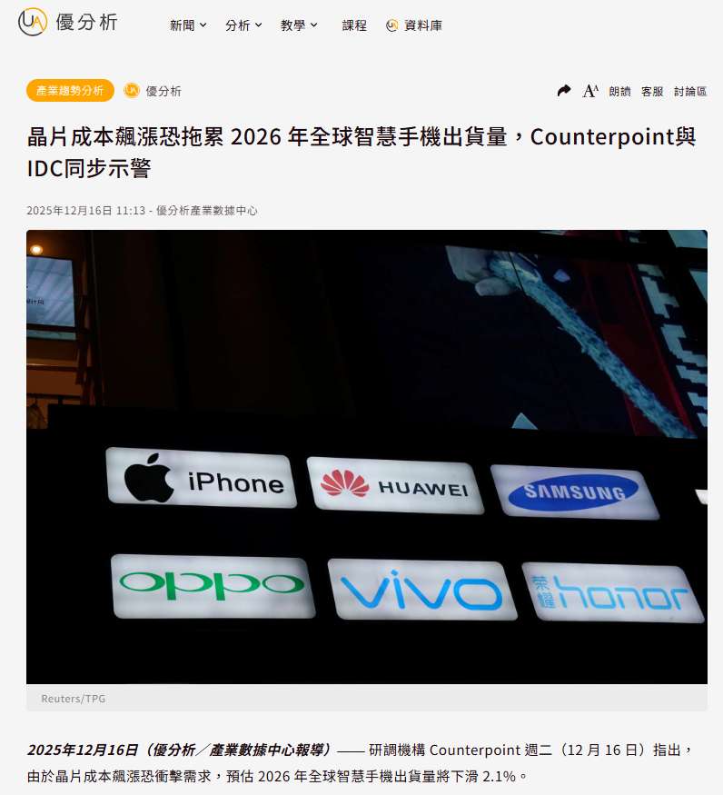 現在的穩懋,有很大一部分營收來自智慧型手機或WIFI等消費性應用市場,但我們都知道,接下來手機出貨即將進入淡季,而且根據Counterpoint預測,明年會因為記憶體大漲,手機賣的很爛,照理來說營收不會有特別表現才對,但營收卻大幅優於預期33%。