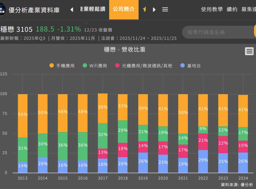 若未來真的朝這個樣子發展,新興應用營收佔比高,手機佔比小,當年度手機展望差,拖累到財報不如預期,對穩懋來說,可能越來越不重要了。