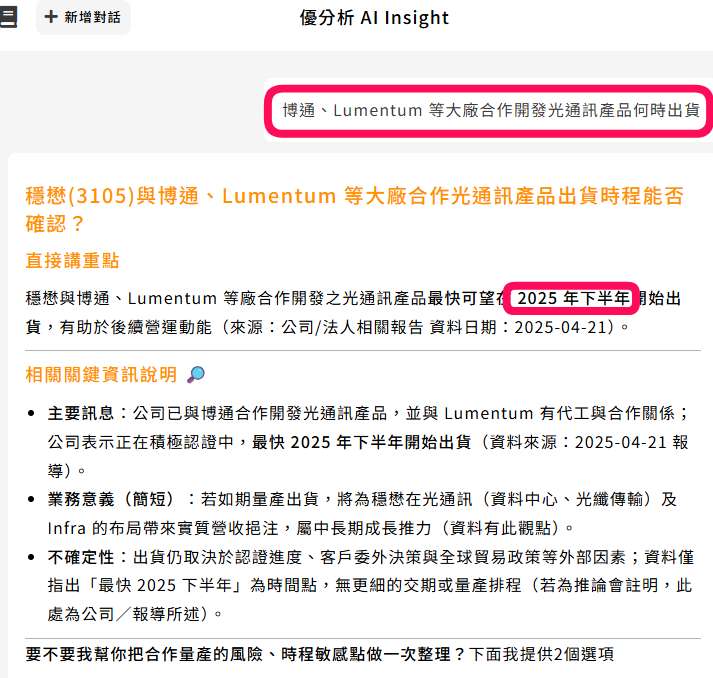公司也與博通、Lumentum 等大廠合作開發光通訊產品,最快 2025 年下半年出貨。我們可以用優分析產業資料庫裡的 AI Insight,直接問他什麼時候出貨,就可以確認這件事。