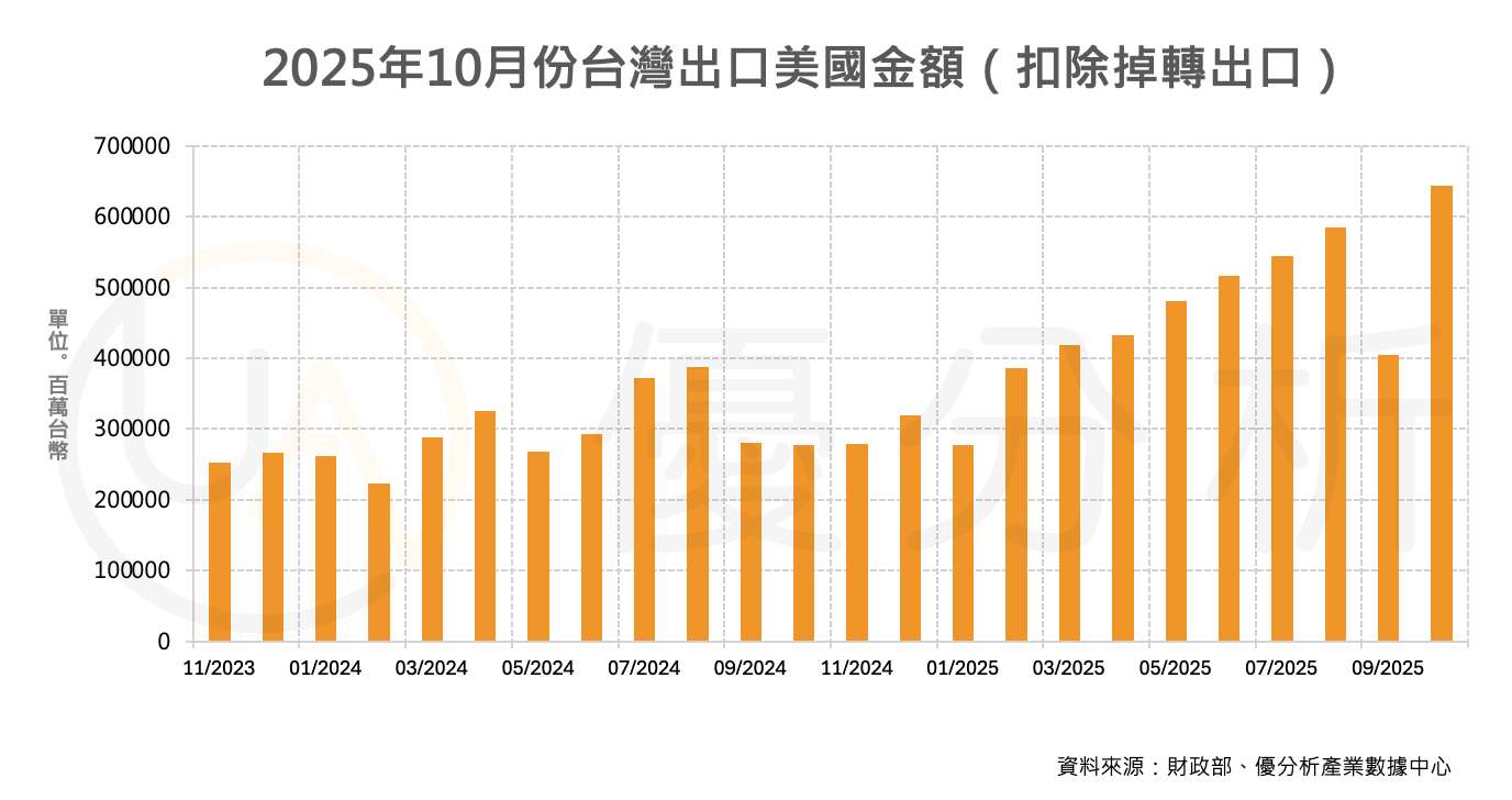 10月對美出口大幅跳升 144.3% 至 211.35 億美元(6,440億台幣),顯示美國科技業的AI晶片採購潮持續升溫。雖然美國對台商品維持 20% 關稅,但半導體產品暫時排除在外,台北正與華府洽談關稅下調方案。