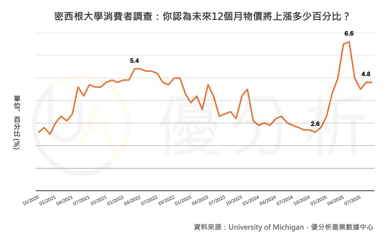 調查進一步顯示,消費者對當前經濟環境的評估指數為61.2點,較上月下滑,反映對商業環境與就業市場的擔憂升高。在通膨預期方面,消費者對未來一年的通膨預期維持在4.8%,但對未來五年的通膨展望自3.5%升至3.9%。
