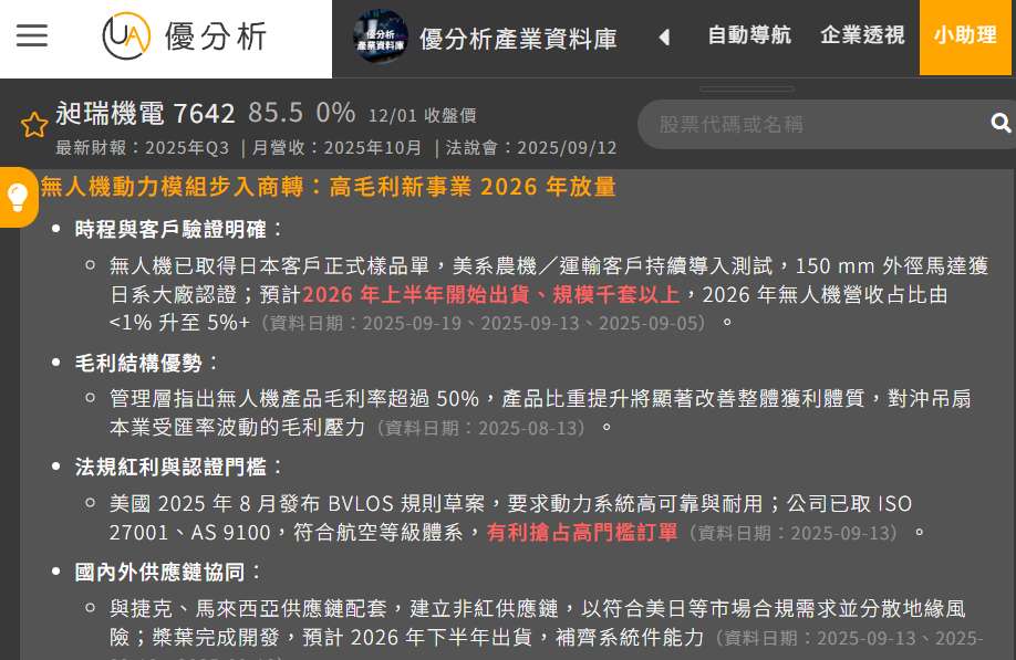 這項政策也正與昶瑞機電(7642-TW)近年轉向無人機動力模組(馬達+電調 ESC)的策略布局不謀而合,預計於2026年放量優化整體獲利結構。