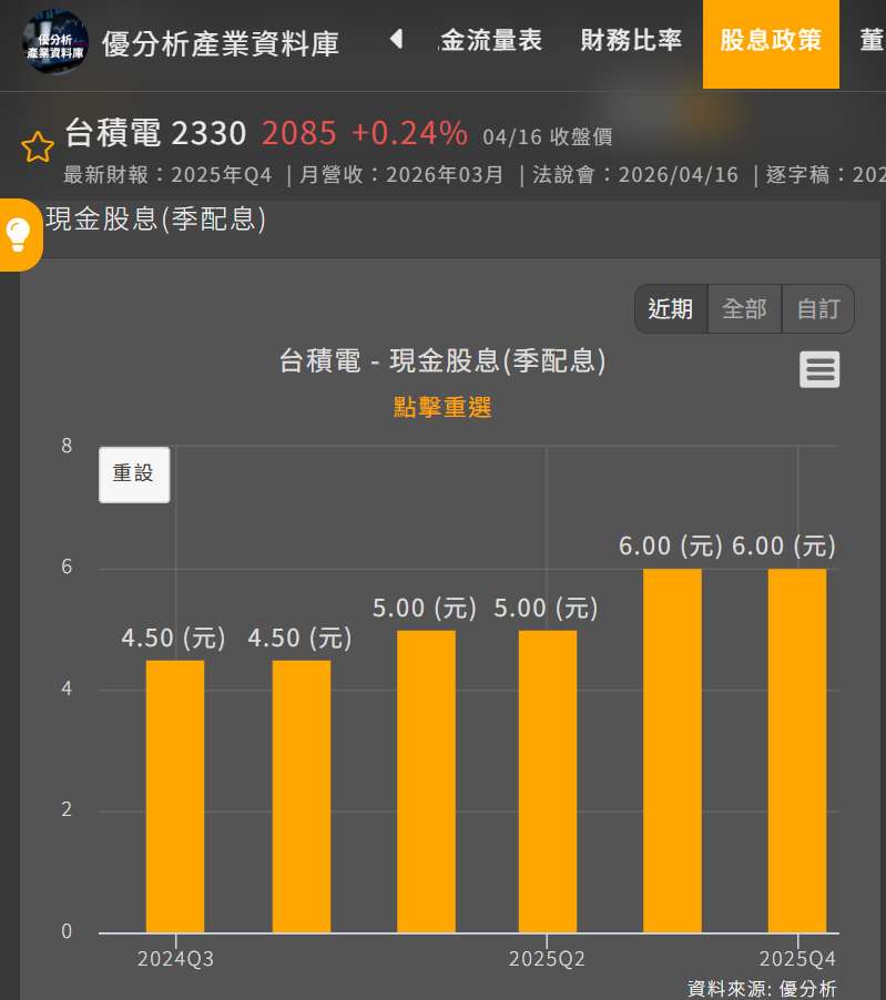 股息角度: 台積電每半年調升一次股息,若未來朝向季配 7~8 元邁進,年領 30 元股息指日可待。