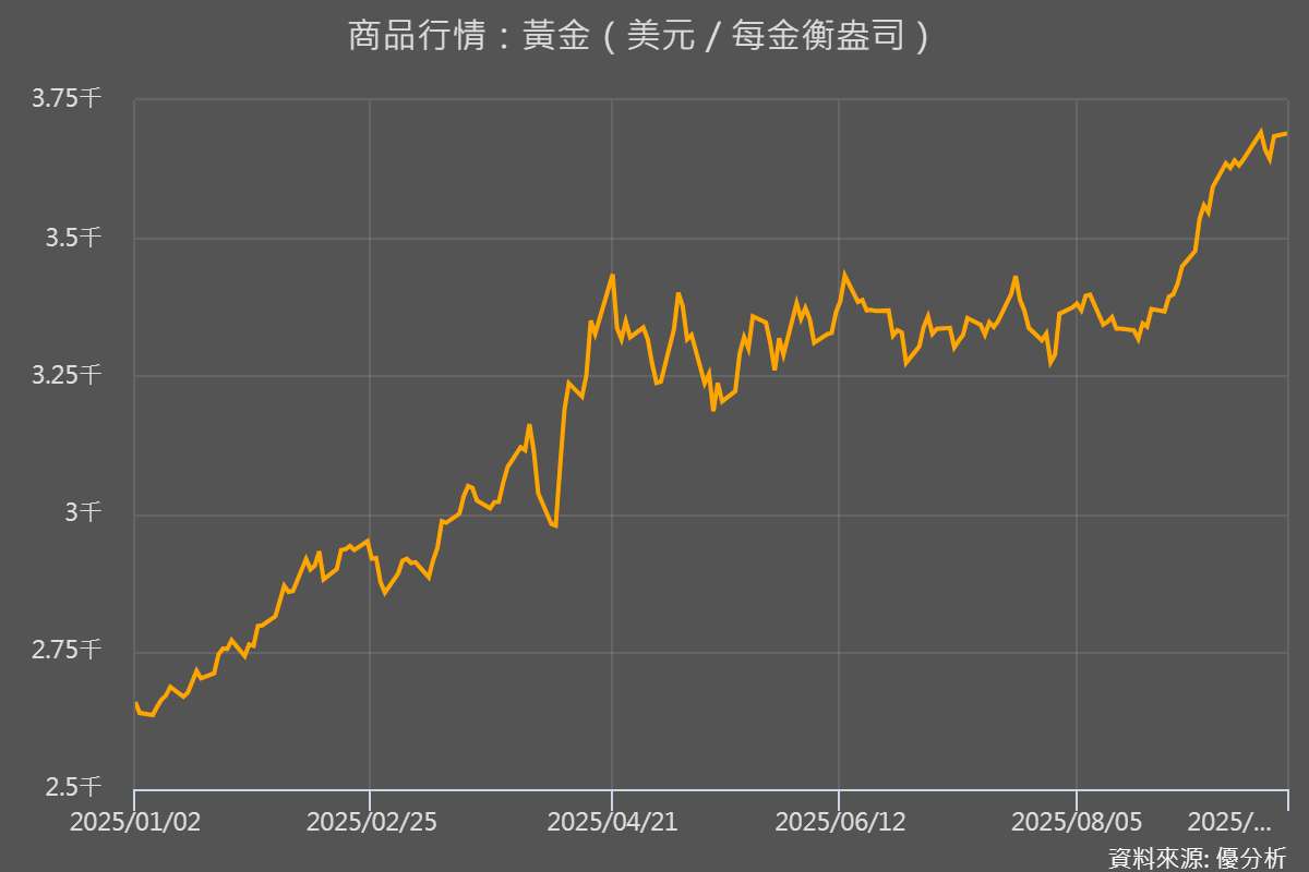 格林威治時間 9 月 22 日 00:44(台北上午 8:44),現貨金小幅上漲 0.1%,報每盎司 3,689.08 美元,仍徘徊在歷史高點附近;上週三(9/17)一度觸及每盎司 3,707.40 美元的歷史新高。