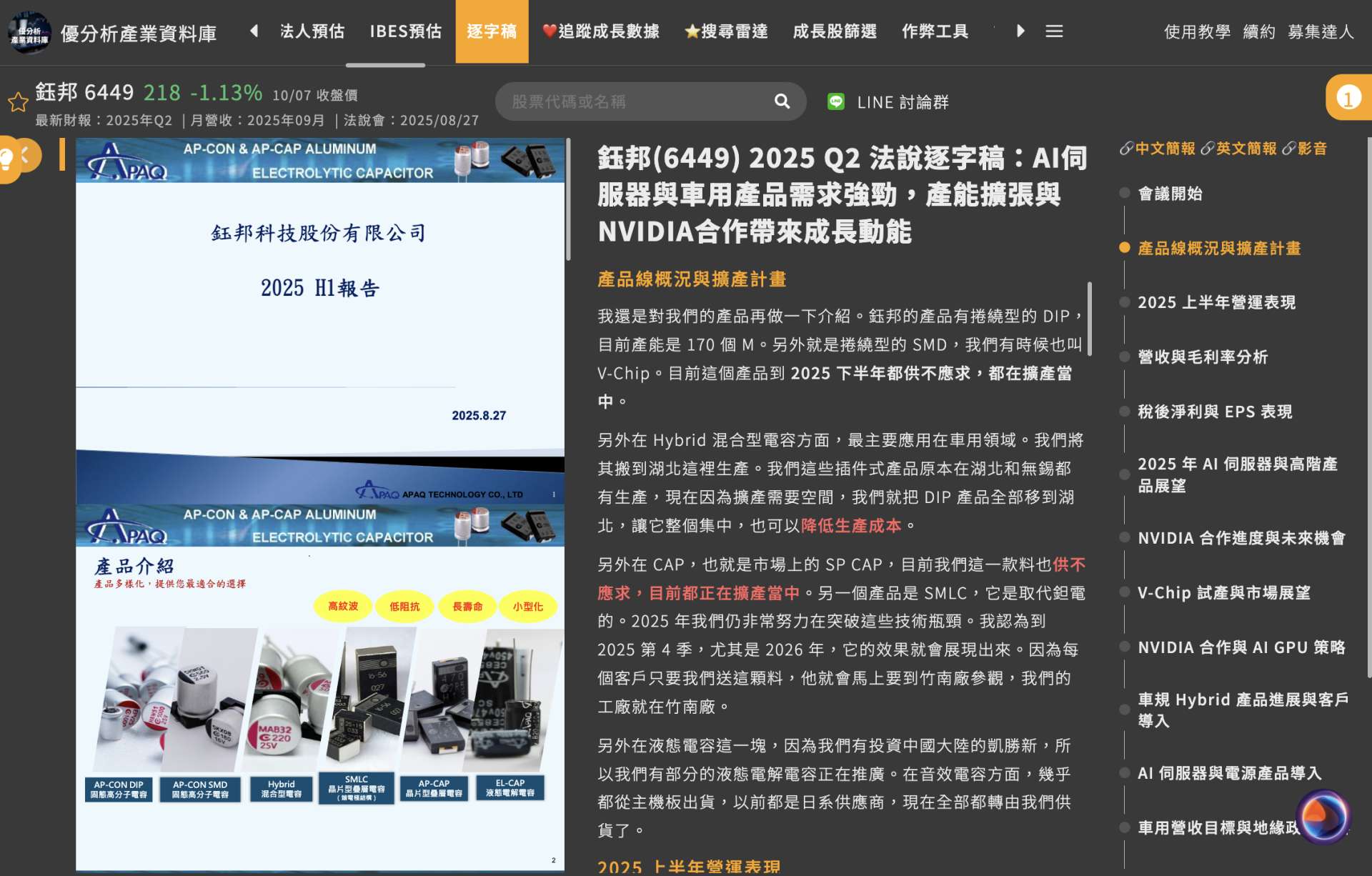 隨著AI需求強勁,鈺邦正積極提前擴充V-Chip產能。原定於2027年達成的每月1億顆產能目標,現已提前至2025年第四季完成,第三季產能更已較前季提升逾兩成。公司同時規劃於2026年將V-Chip產能再提升至1.2億顆/月,以滿足AI伺服器與GPU平台持續成長的市場需求。另一主力產品晶片型固態電容(CAP),也將於明年將月產能倍增至1億顆,強化整體產品組合的高階化與利潤結構。