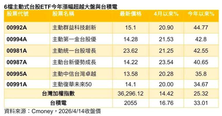 這 6 檔主動式 ETF 分別為主動群益科技創新 (00992A-TW)、主動第一金台股優 (00994A-TW)、主動統一台股增長 (00981A-TW)、主動台新優勢成長 (00987A-TW),主動中信台灣卓越 (00995A-TW),及主動復華未來 50(00991A-TW),且這 6 檔主動式台股 ETF 在 4 月份以來已上漲逾 20%。