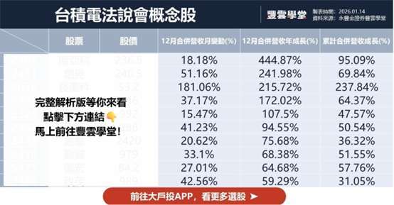 台積電即將於 1/15 日舉行法人說明會,成為本周市場最受矚目的焦點。隨著法說會進入倒數,市場普遍預期,台積電今年資本支出規模有機會再度上修。台積電上週公布 2025 全年營收,金額超過新台幣 3 兆 8090 億元,較 2024 年同期成長 31.6%,創下歷史新高;2025 年第 4 季營收首度突破 1 兆元,季增逾 5%。台積電 2026 年第一季每股盈餘(EPS)預估上修 24%,至 18.4 元,季增 2%、年增 32%;同時,上修 2026 年全年 EPS 19%,至 85 元。