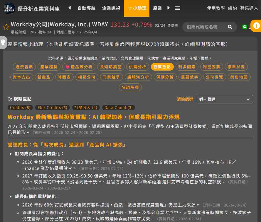Workday, Inc. (WDAY-US) 是一家專注於企業雲端應用的全球軟體公司,核心產品涵蓋人力資本管理(HCM)、財務管理、支出管理、規劃與分析,服務約 11,500 家企業、合約用戶數約 7,500 萬名,並已滲透超過 60% 的《財星 500 大》企業。公司採純訂閱制 SaaS 模式,HR 與財務系統屬於企業最核心的交易與紀錄平台,負責薪資、關帳、合規與跨國法規處理,屬於高轉換成本、高黏著度的基礎系統。