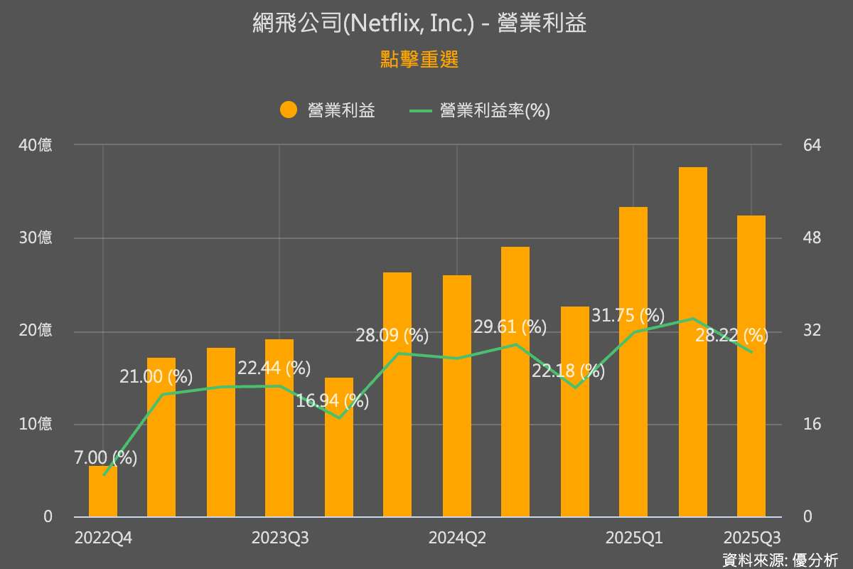 Netflix本季淨利為25億美元,每股盈餘(EPS)5.87美元,低於分析師預估的30億美元與6.97美元。營收115億美元則符合預期。公司指出,若排除稅務爭議影響,第三季營業利益率將高於預期的31.5%,實際報告為28%,並強調事件不會對後續財務造成重大影響。