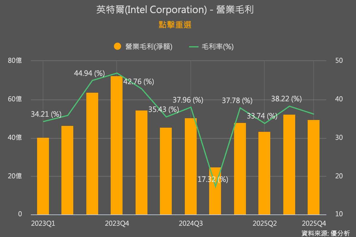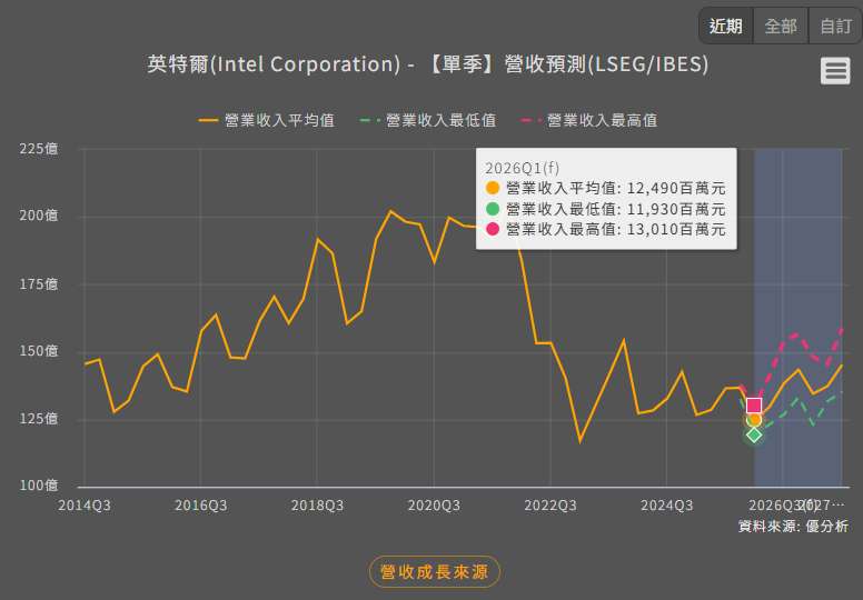 英特爾指出,本季營收預估介於117億至127億美元,低於市場平均預期的124.9億美元;調整後每股盈餘預估僅能損益兩平,也不及市場原先預期的每股盈餘0.05美元。公司坦言,儘管產線已滿載運轉,仍無法即時擴充產能以因應資料中心伺服器晶片需求,導致部分高毛利訂單流失。