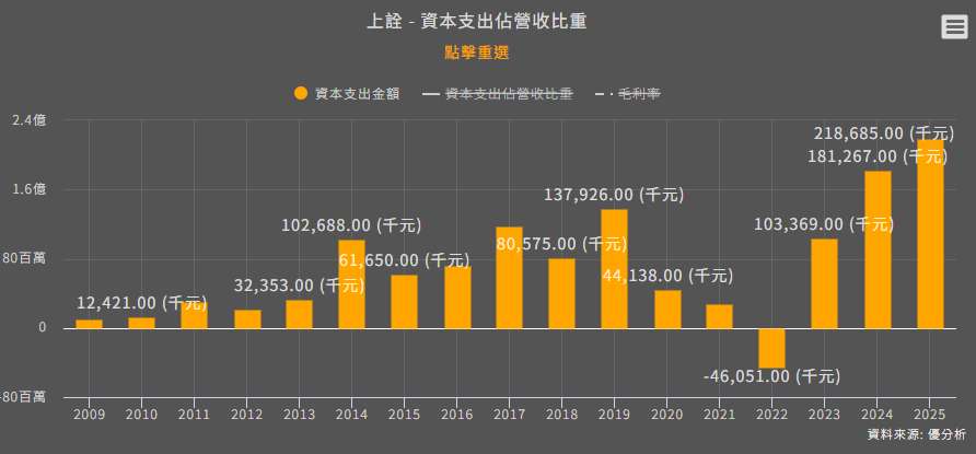 觀察上詮過去的財務結構,資本支出長期維持在數千萬至兩億元左右的規模,但邁入 2026 年後,公司上修的資本支出預算展現了極具侵略性的擴張動能。2026 年規劃投入約 15.8 億元,增幅達數倍之多,這在光通訊零組件產業中實屬罕見。
