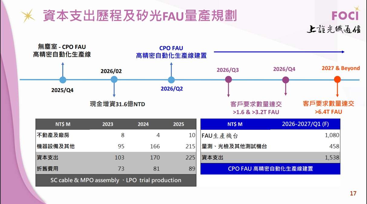 根據公司在法說會中提及其中高達 10 億元以上將直接投入購置 CPO FAU 自動化生產與測試機台。這種大幅增加資本支出的策略,反映出公司已不僅止於實驗室開發,而是根據特定國際大客戶的量產預期進行投產,展現了極高的訂單能見度與產品落地的確定性,也為進入國際 AI 供應鏈奠定了實質的產能基石。