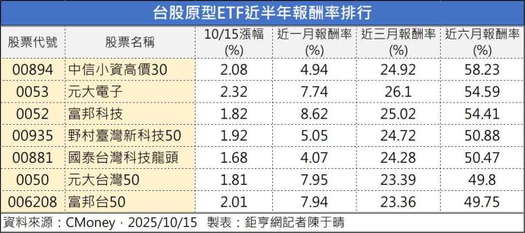 雖然台股昨 (14) 日開高走低收黑,但半導體設備製造商艾司摩爾 (ASML) 訂單表現優於預期,帶領多頭展開反攻,今 (15) 日在護國神山台積電領軍創高激勵下,加權指數大漲 482.56 點,收 27275.71 點,逼近歷史高位。而自 4 月川普公布對等關稅以來已過半年,加權指數反彈約 4 成,而市值型 ETF 如元大台灣 50(0050-TW)、富邦台 50(006208-TW),近半年報酬率更接近 5 成,不過,根據統計,有 5 檔台股原型 ETF 近半年含息報酬率在 5 成之上,勝過 0050、006208。