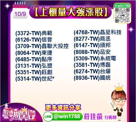 化工族群方面,(1727-TW)中華化,斥資 10 億元打造的第五條電子級硫酸產線已完成建置並啟動測試,最快第四季量產,年產能倍增至 3 萬噸,將鎖定半導體大廠訂單,隨新產線貢獻,電子化學品營收占比可望突破四成,推升營運動能,同時,電力與再生能源族群也持續受資金青睞,(1609-TW)大亞,即將挑戰前波高點,受惠於台電強韌電網計畫與再生能源建設推動,長線基本面具政策支撐。