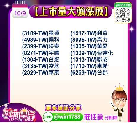 其中權值股方面,(2330-TW) 台積電,上漲 1.77%,收在 1440 元,今日公布 2025 年 9 月合併營收達新台幣 3,309.8 億元,月減 1.4%,年增 31.4%,前 9 月累計營收 2.76 兆元,年增 36.4%,創歷史同期新高,第三季營收 9,899.17 億元,超越財測高標,展望後市,3 奈米與 5 奈米需求強勁,2 奈米製程尚未開出即滿載,AI 與智慧手機晶片帶動產能利用率幾近 100%,供應鏈預期滿載情況可望延續至 2025 年第二季;(2317-TW) 鴻海,下跌 1.56%,收在 221.5 元,今日小回檔,日產 Nissan 與本田 Honda 於今年 2 月終止合併協商後,傳出鴻海有意收購日產追濱工廠、合作生產電動車,然而根據日媒最新報導,因日產談判進展遲緩、過程屢次拖延,導致鴻海不耐久等,最終於 9 月中決定退出談判,雙方合作案正式破局;(2308-TW)台達電,上漲 1.83%,收在 999 元,公布 9 月合併營收達 570.61 億元,月增 19.2%,年增 53.8%,創下單月新高,累計今年前 9 月營收為 3,932.72 億元,較去年同期成長 28.1%,受惠於 AI 伺服器電源與資料中心基礎設施需求強勁,營收持續維持高檔,顯示公司在高效能運算與電源管理市場的競爭優勢持續擴大。
