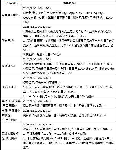 2. 聖誕祭商戶優惠:各家活動期間及辦法請洽台新 / 新光銀行信用卡優惠官網