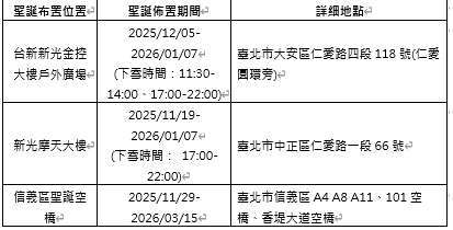 今年台新新光金控在台北市仁愛圓環打造全新升級的冬季繽紛聖誕,高達 15 公尺的聖誕樹每 30 分鐘定時飄下浪漫雪花,搭配會轉動的聖誕摩天輪與璀璨光廊,營造冬日限定的佳節氛圍,民眾可在「下雪聖誕樹」前拍照打卡,感受飄雪與燈光交織的溫馨聖誕。除了仁愛圓環外,台北車站對面的新光人壽摩天大樓前也設置一棵 15 公尺高、同樣會下雪的聖誕樹,搭配繽紛聖誕裝置妝點,成為北車週遭夜色中最閃耀的焦點。台新新光金控同時在金控總部及人壽子公司總部前裝置溫馨的聖誕造景,不僅象徵延續多年傳統,更代表集團將邁向嶄新里程碑。