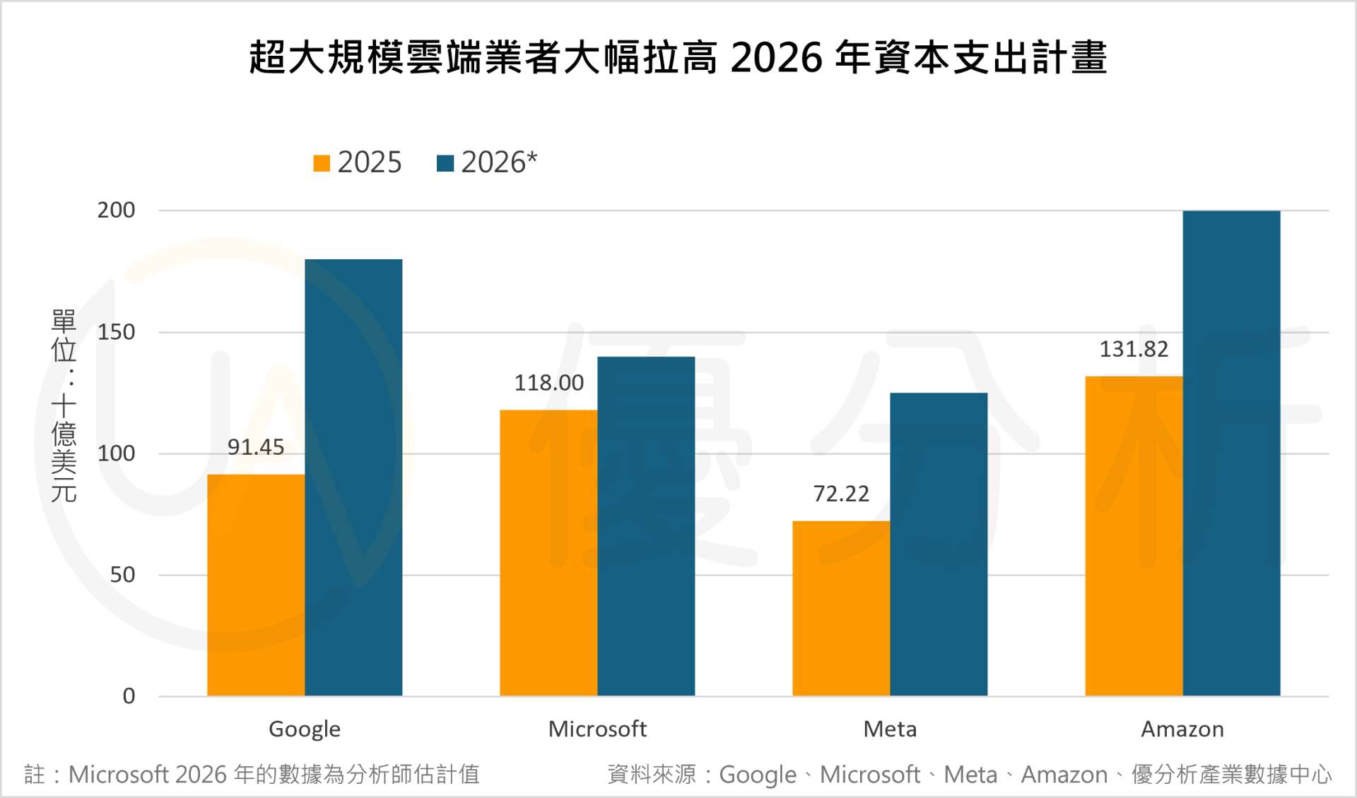 Microsoft (MSFT-US) 雖未在同一時間點明確給出 2026 年資本支出區間指引,但分析師預測其 2026 年資本支出約 1,400 億美元,較 2025 年實際支出約 1,180 億美元進一步提高。