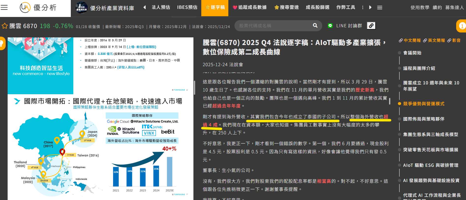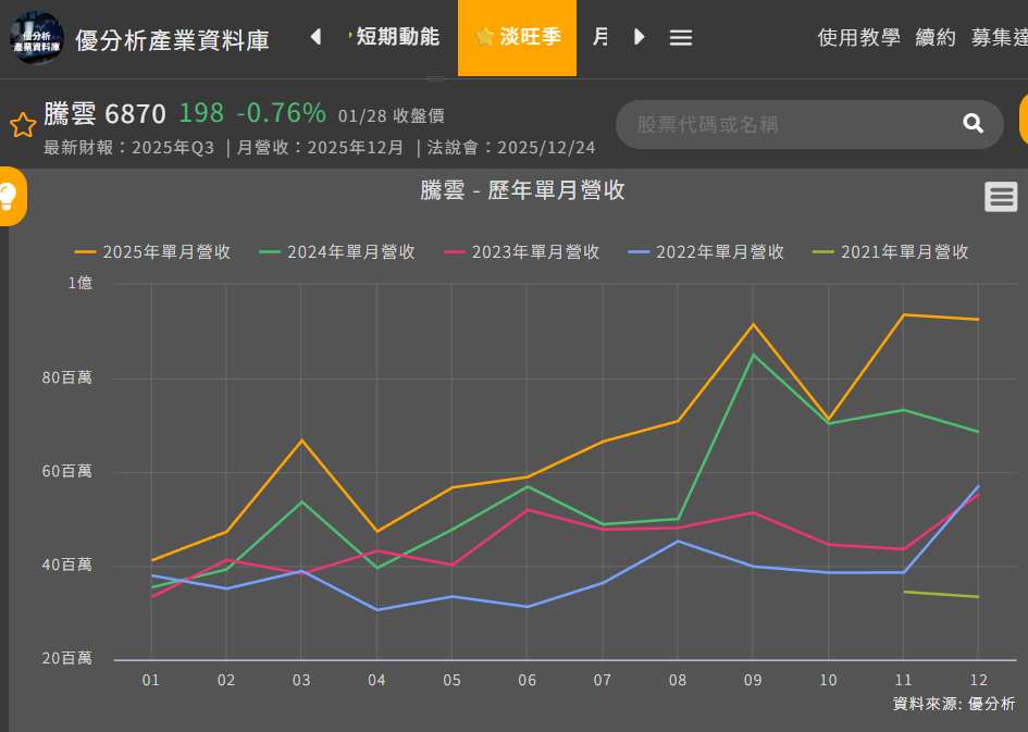 在營運表現方面,騰雲(6870-TW)2025年累計合併營收年增約20.32%,達8億元以上,已明顯超越2024年全年6.68億元水準,顯示核心業務成長動能持續擴大。