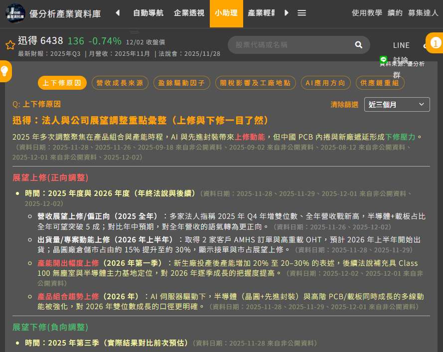 毛利率下滑的主因來自 PCB 市場的結構性問題。近兩年中國 PCB 廠為了搶 AI 伺服器、車電相關的訂單大量擴產,產能供給過剩後,設備端自然被迫削價。迅得為了維持出貨量,只能接受部分低毛利訂單,加上少數中國客戶拉長付款周期、公司需要提列壞帳,再加上泰國廠剛投產、初期稼動率偏低,這些因素共同把第三季毛利率壓到僅剩 19.8%。