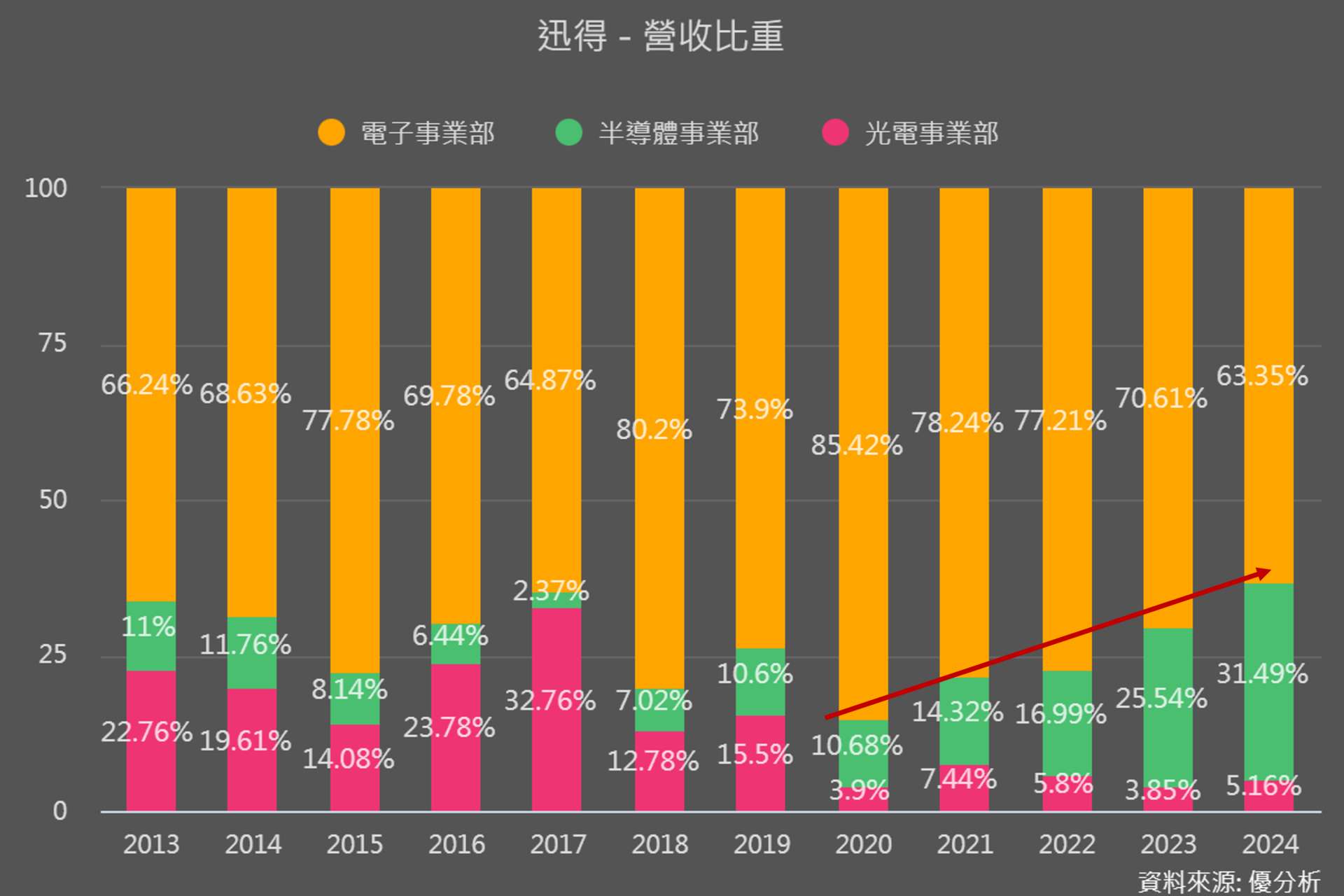 從下圖可以看到營收結構上明確的變化:半導體事業部占比從早年約 10% 一路攀升,到 2024 年已突破 30%,根據最新資料,2025 年前三季更達 43%,全年甚至有機會接近 50%。