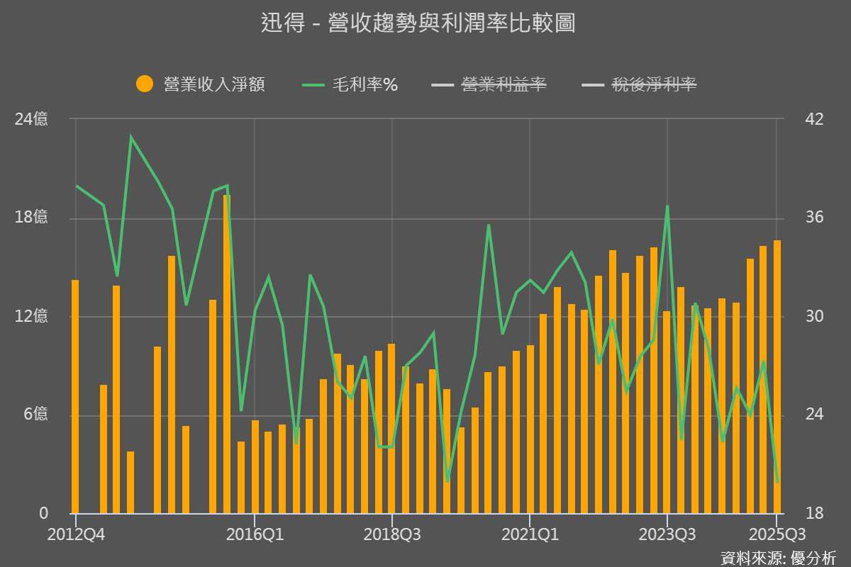 2025年12月03日(優分析/產業數據中心報導)⸺ 迅得(6438-TW) 11 月營收達 5.70 億元,月增 8.48%、年增 29.22%,創四個月來新高,前 11 月累計營收更達 59.48 億元、年增 26.71%,全年挑戰 60 億元幾乎已成定局。從營收來看,公司的基本動能很強,但如果把營收與毛利率放在一起看,故事就不一樣了:營收一路往上,毛利率卻一路走低。這個落差,就是理解迅得現在狀況的關鍵。