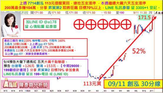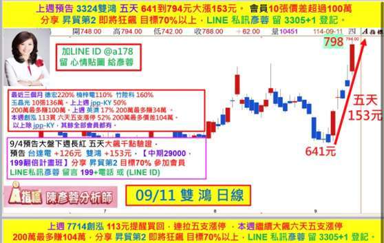 賀本欄預告的 竹陞科 (6739-TW) ,德宏(5475-TW),楠梓電(2316-TW),國精化(4722-TW),雷虎(8033-TW),攸泰(6928-TW),金居(8358-TW),南電(8046-TW) 全部兩個月翻倍 100%。本欄預告 台達電(2308-TW),五天大漲 126 元,雙鴻(3324-TW) 五天大漲 145 元! 想要領先於 每天早上九點前 得知當天誰有機會長紅漲停? 1-2 個月後資金翻倍 100%,歡迎點下面連接 加 LINE 留言 777+1 可領先得到提醒。