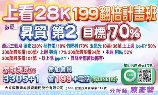 預告 昇貿 (3305-TW),1.5 個月 100%。【竹陞科 第 2】,即將發動目標翻倍,加 line 留言【777+2】索取。