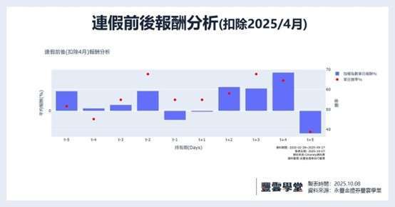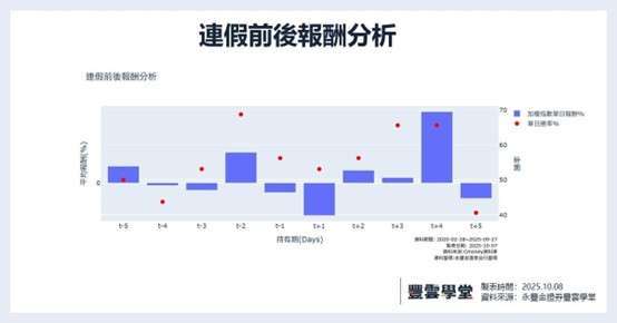 統計 2020~2025 年連假前後加權指數報酬 (如下圖),圖中 t-1 代表連假前一天、t+1 代表連假後一天,以此類推,在連假前兩天上漲機率來到 68.75%,平均漲幅為 0.29%,而連假前一天平均跌幅 - 0.09%,顯示投資人在連假前拉高股價、並在連假前一日調節部位。