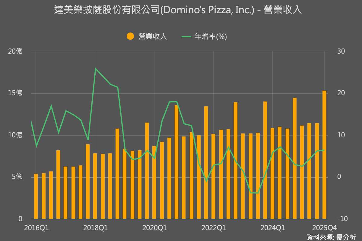 2026年02月24日(優分析/產業數據中心報導)⸺ 在消費者對價格更為敏感之際,達美樂以優惠方案與新品策略成功帶動銷售成長。Domino's Pizza(DPZ-US)公布第四季財報顯示,美國同店銷售表現優於市場預期,激勵股價早盤上漲約5%,至截稿前維持2%以上漲幅。