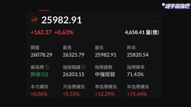 台股 10 月第一個交易日,盤勢相當激烈,開盤跳空開高一度站回兩萬六大關,不過在 9 點 40 分後開始走弱,一路走低終場收最低點 25982 點,不過仍是收復所有均線之上,上漲 162 點,成交金額為 4565 億元。鉅亨贏指標專任技術分析講師 J 董分析,目前大盤多空趨勢尚未明確,接下來幾天若再破低點,「空方趨勢」就會正式確立!