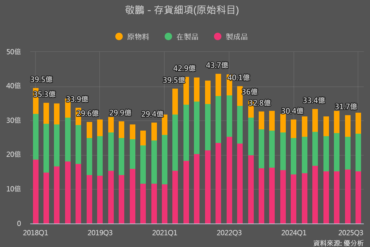 更能反映經營體質的,其實是存貨結構。從存貨水位、原物料備料與製成品變化來看,敬鵬的營運步調一直穩穩地落在合理範圍內。製成品並沒有堆積,也沒有滯銷跡象,顯示客戶需求與公司排產維持健康銜接;原物料與在製品的水位也沒有異常波動,代表公司生產緩急掌控得宜,而非進入大幅砍單或急單的混亂階段。