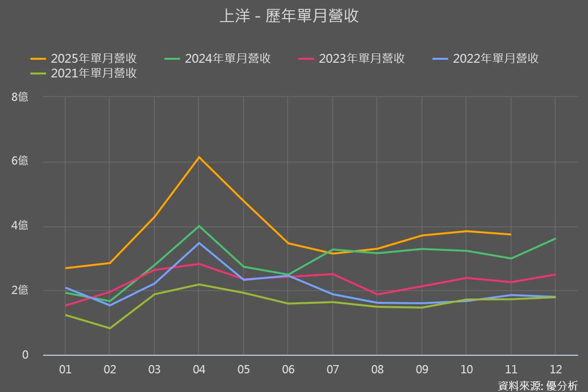 在這樣的環境下,耐久財與住宅高度連動的產業普遍承壓,但上洋(6728-TW) 卻仍交出逆勢成長的成績。公司累計 2025 年前 11 個月營收達 41.87 億元,年增約 32.92%,已超越 2024 年全年水準,顯示其營運動能並未隨住宅市場降溫而同步轉弱,也成為觀察上洋產業定位與成長結構轉變的重要切入點。