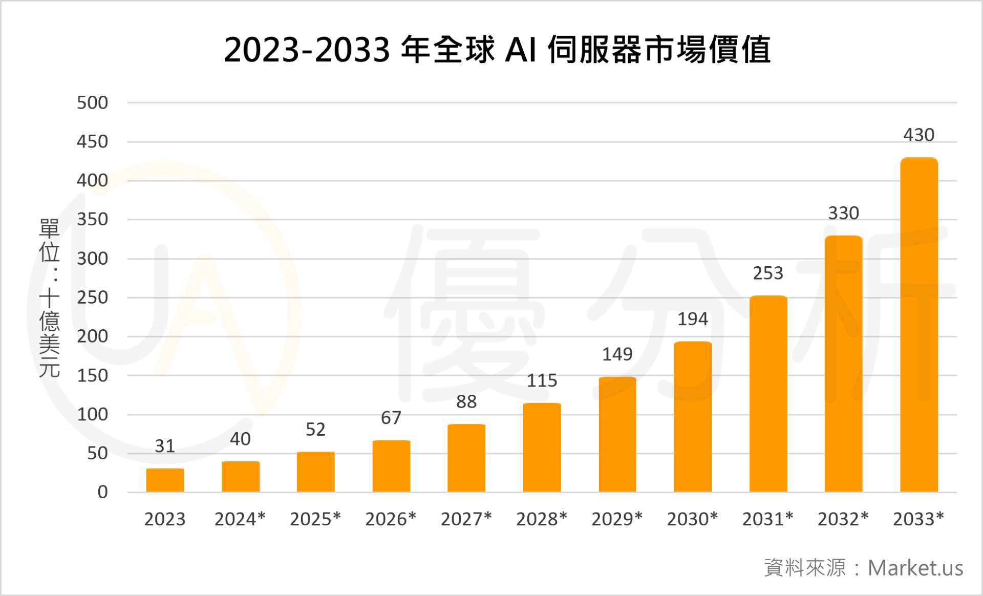據 Market.us 資料顯示,預計到 2033 年,全球 AI 伺服器市場規模將達到 4,300 億美元。AI 應用將帶動高效散熱需求持續擴張,也進一步帶動相關產業鏈良好的成長空間。