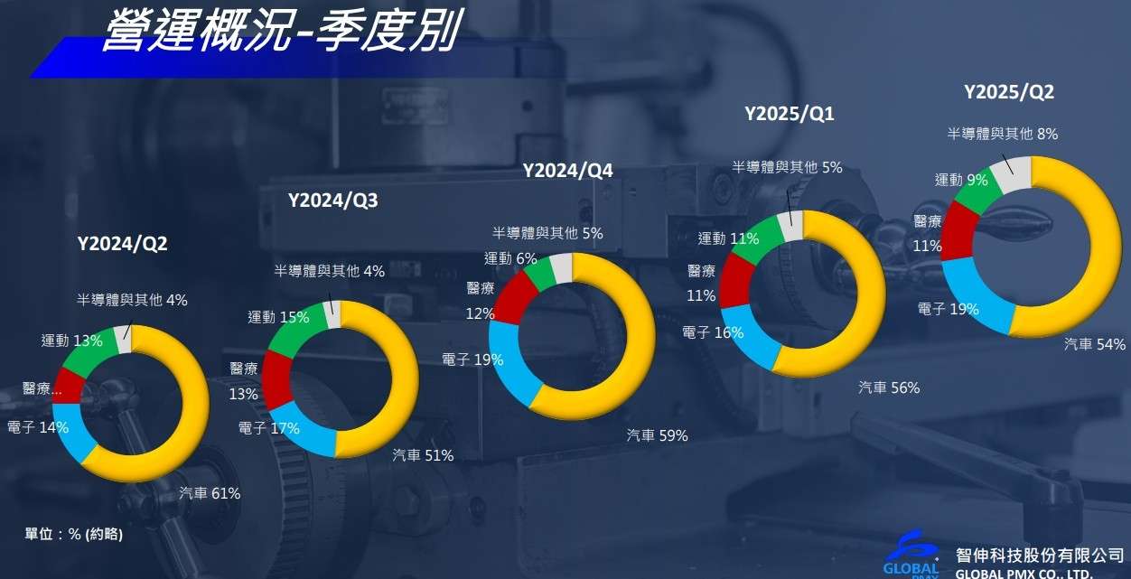 營收結構涵蓋汽車、電子(含硬碟)、醫療、運動與半導體等領域。近年非汽車事業比重明顯上升,從年初約 45.9% 提升至 46–49% 區間,顯示營收來源更加分散,且醫療與電子、AI/半導體等新事業貢獻逐步放大。