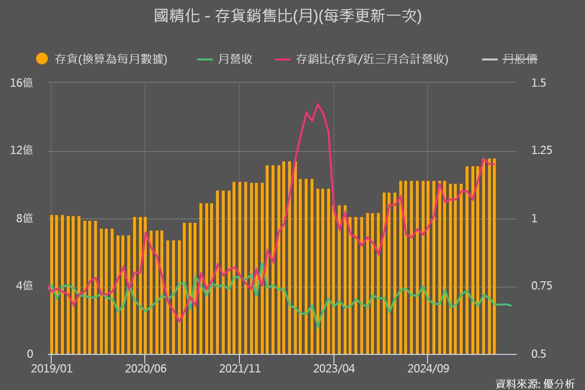 但反過來看下圖,國精化自身的存貨變化,存貨雖然也在墊高,但上升的斜率跟幅度看起來相對溫和,存銷比持續走高。