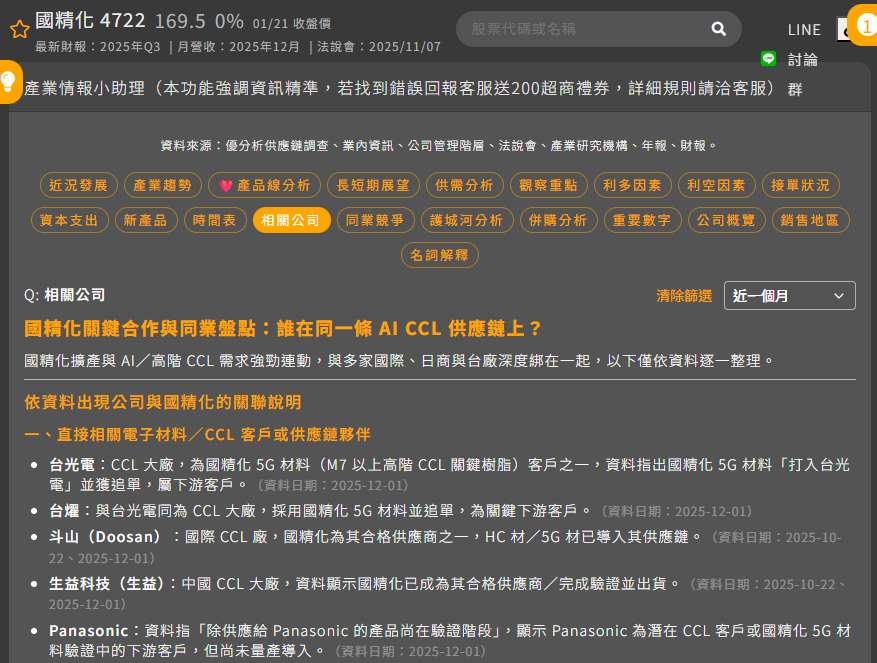 首先,國精化應用於 M7 以上高階 CCL 的高速運算 5G 樹脂(HC 材),已取得台光電、台燿、斗山、生益科技等主流 CCL 大廠認證並實際出貨。公司也指出,開發 M7~M9 板材的廠商,幾乎都已將國精化的 5G 材料納入供應鏈,僅 Panasonic 的相關產品仍在驗證階段。