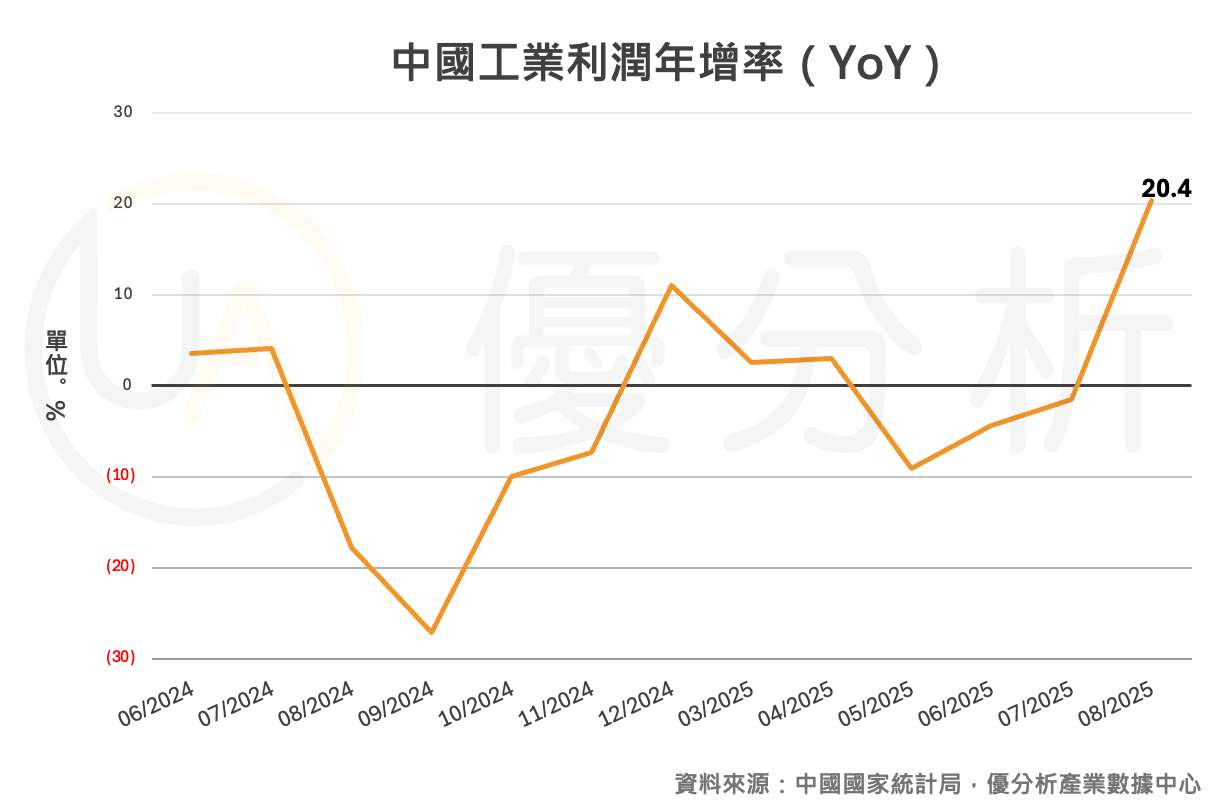 中國國家統計局週六公布數據顯示,2025年8月工業利潤年增20.4%,扭轉7月年減1.5%的頹勢,累計1至8月利潤也轉為年增0.9%,相較1至7月的年減1.7%明顯改善。